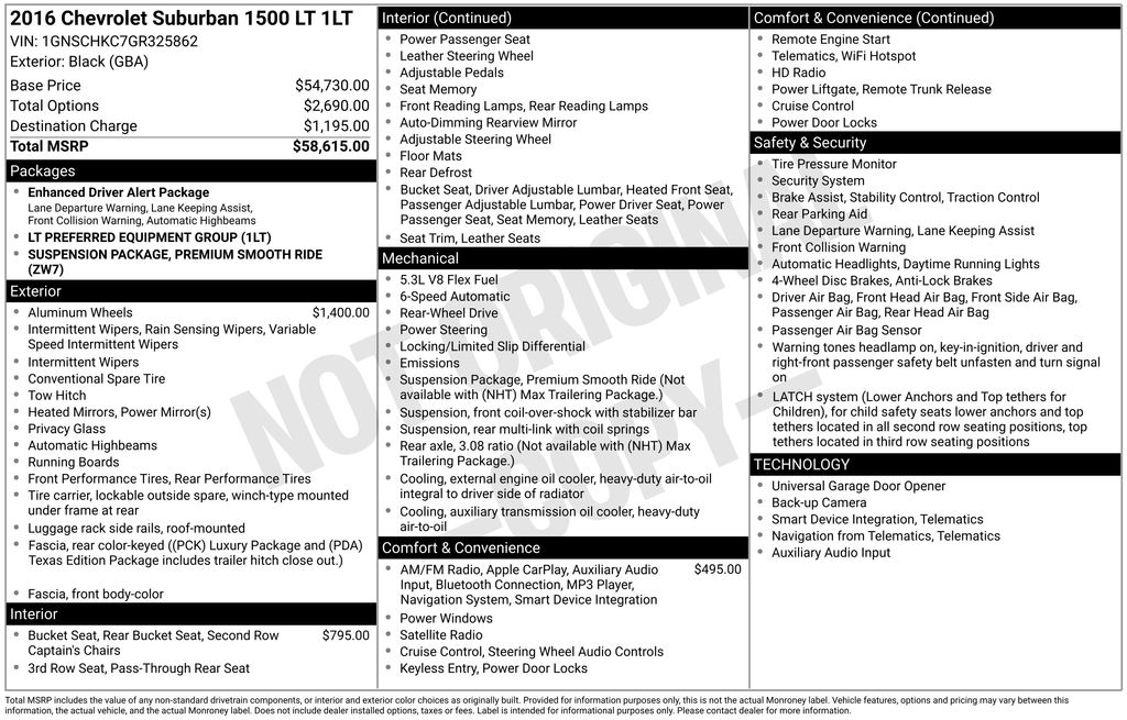 This Suburban's sleek Black exterior and well-appointed interior create a striking, sophisticated appearance that is sure to turn heads. With its impressive capabilities, advanced technology, and premium amenities, this 2016 Chevrolet Suburban LT is the ultimate family-friendly SUV.