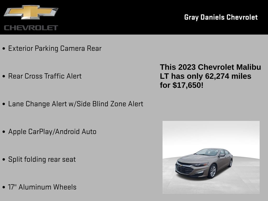 With a list price of $17,995, this 2023 Chevrolet Malibu LT 1LT represents an exceptional value in the midsize sedan market. Experience the perfect balance of style, technology, and performance that this Malibu has to offer. Visit our showroom today and let us demonstrate why this exceptional vehicle should be your next automotive choice.