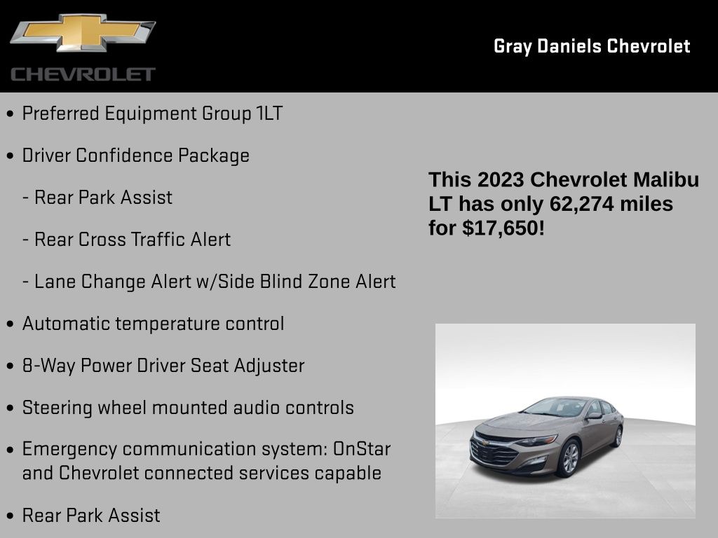 Elevate your commute with the impressive array of features that come standard on the 2023 Malibu LT 1LT. Enjoy the convenience of Automatic temperature control, the versatility of the 8-Way Power Driver Seat Adjuster, and the intuitive control of Steering wheel mounted audio controls. Stay connected with the Emergency communication system: OnStar and Chevrolet connected services, and enhance your driving experience with the Exterior Parking Camera Rear, Rear Park Assist, Lane Change Alert with Side Blind Zone Alert, and Rear Cross Traffic Alert.